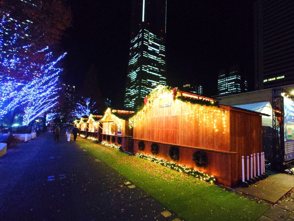 会場は、両側にヒュッテが並ぶ細長いストリート。その向こうにはクイーンズスクエアや横浜ランドマークタワーなどの高層ビルがそびえ、頭上にはヨコハマミライトの青いイルミネーションがきらきら。