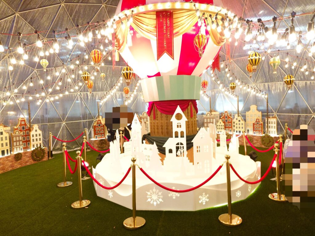 会場中央にどーんと構えているのが、直径約10m・高さ約6mの巨大ドーム型フォトスポット「SNOW DOME(スノードーム)」。半透明のドームの中は、気球モチーフやミニチュアの街並みが並ぶファンタジックな空間になっています。
