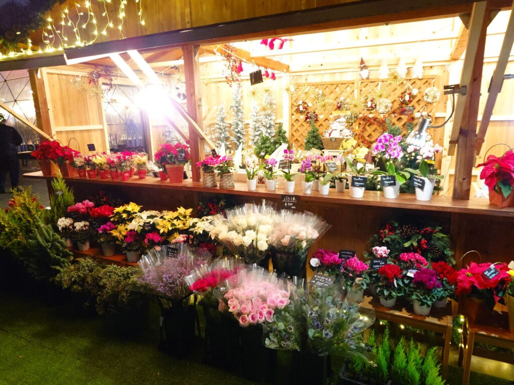 グランモールのマーケットで印象的だったのが、色とりどりのお花屋さんのブース。白やピンク、赤のバラの花束、ポインセチアやシクラメンの鉢植え、もみの枝やグリーンを使ったリースやスワッグなど、見ているだけで心が躍るラインナップです。