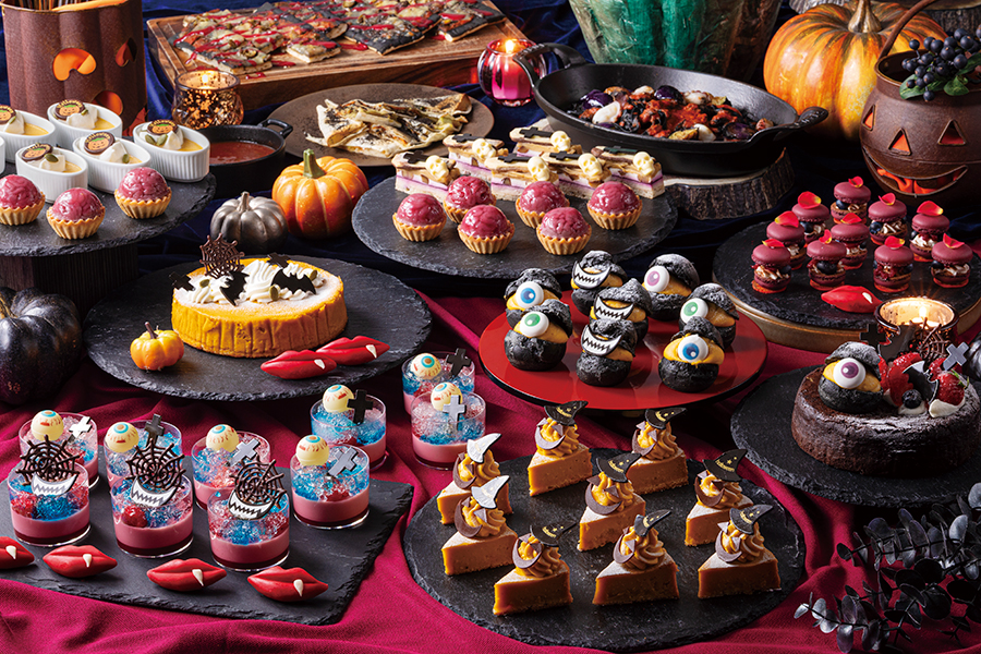 さらに6日間限定で開催されるスイーツブッフェでは、紫芋モンブランのライブ仕上げや、目玉を模したブラックシュークリームなど、全15種類以上のスイーツが堪能できます。