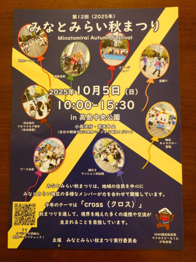 それが、毎年秋に高島中央公園で開催される「みなとみらい秋まつり」。2025年は10月5日(日)10:00~15:30に第12回目を迎えます。私たちのマンションにもチラシが配られていました。