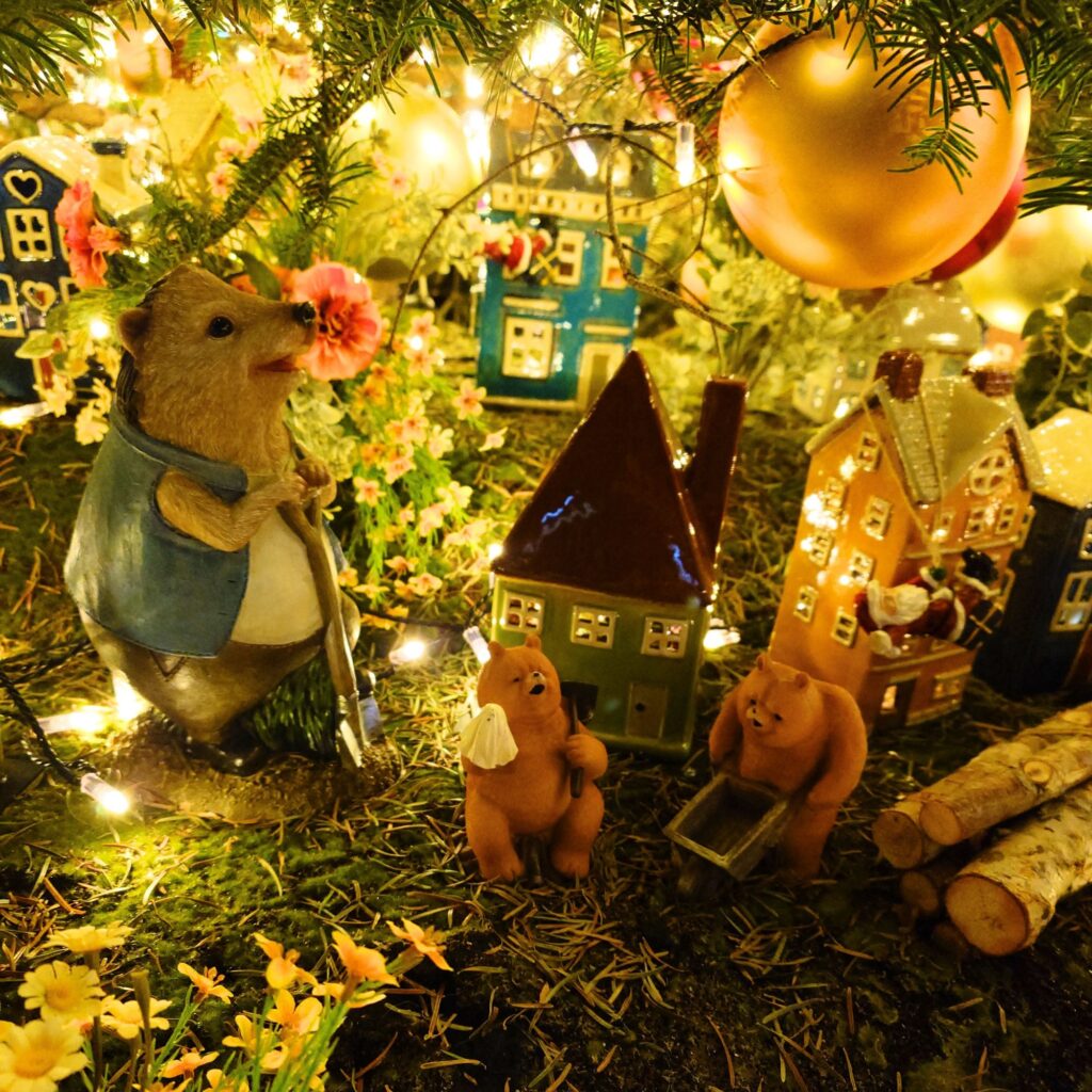 近くで見ると、小さな動物たちやミニチュアの街並みがツリーの足元に広がっていて、細部がとにかく楽しい!