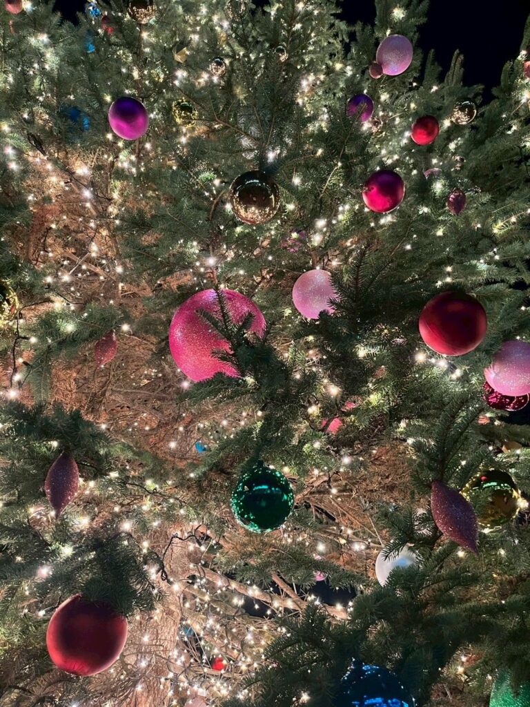 色鮮やかなオーナメントと輝くイルミネーションが全体に散りばめられ、近づくほど光に包まれていくような感覚に。