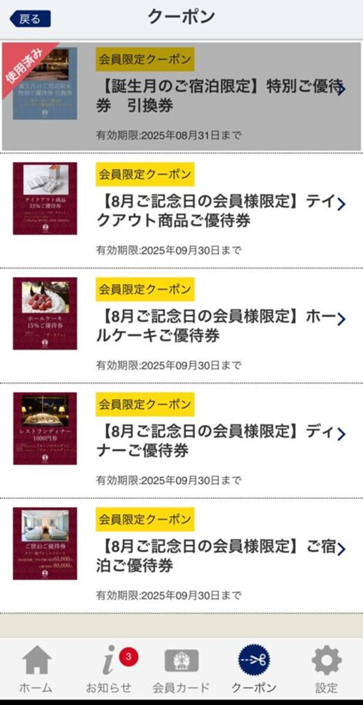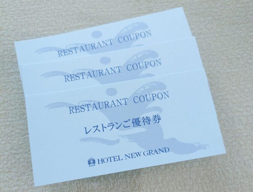 ちなみに今回はお誕生月の宿泊だったのでレストランご優待券3,000円分がついてきました(*’▽’)有効期限は宿泊日から2日間なので、滞在中につかうのがおすすめです。こんな感じでニューグランドアプリに使用できるクーポン一覧が表示されるよ