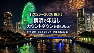 2025→2026年の横浜・みなとみらいで年越しカウントダウンを楽しむための最新ガイド。12月31日の横浜ナイトフラワーズ(花火納め)、コスモクロック21周辺の年越しの雰囲気、0時に花火は上がらない注意点、元旦の終夜運転(JRのみ)まで分かりやすくまとめました。