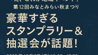 横浜・みなとみらいイベント情報 「え、これが地域イベント?」第12回みなとみらい秋まつり|豪華すぎるスタンプラリー&抽選会が話題 こんにちは、ミナトとミライです。私たちの住む横浜・みなとみらいといえば、観光やデートスポットとして有名な街。赤レンガ倉庫やランドマークタワー、観覧車のコスモクロックなど、華やかな風景が広がっています。週末には観光客が押し寄せ、イベントや音楽... 2025.09.23 横浜・みなとみらいイベント情報