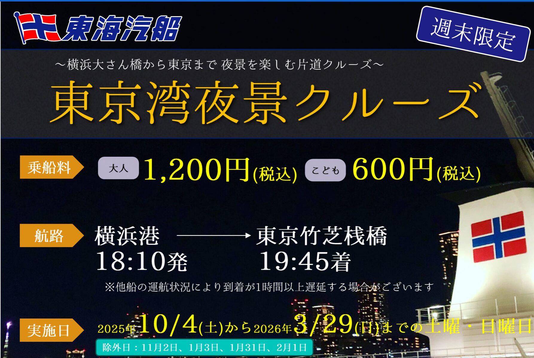 横浜 → 東京の片道ナイトクルーズとして週末のみ運航されます。