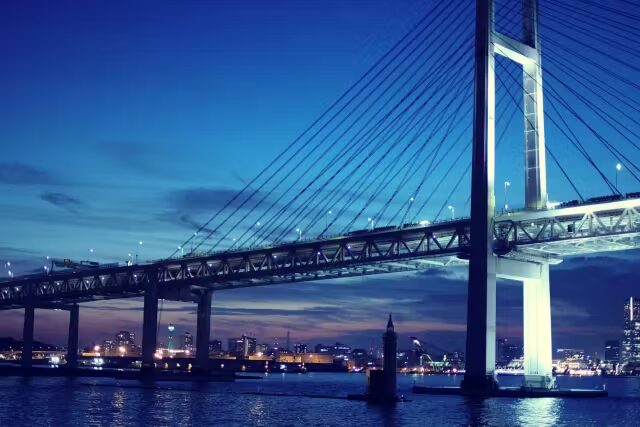 この航路のハイライト。2つの巨大橋を真下からくぐる瞬間は、夜景クルーズならではのスケール感!