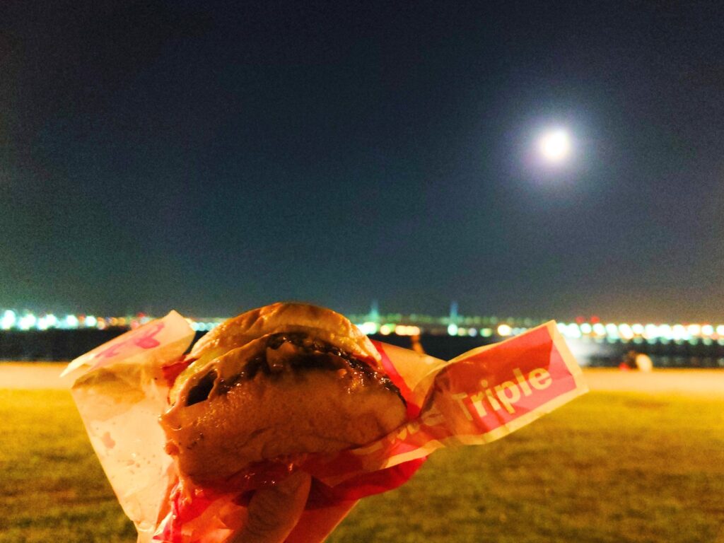 これまで月見バーガーは何度も食べたけど、じっくり月を眺めながらの月見バーガーは実は初めてかも。