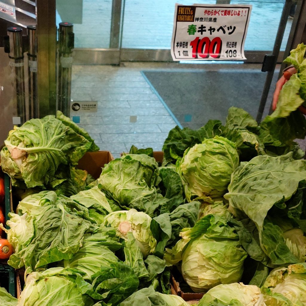 今日立ち寄ったマークイズみなとみらいの地下スーパーで、ふと目に入ったキャベツの山。なんと、三浦産の春キャベツが1玉100円(税込108円)で販売されていました。