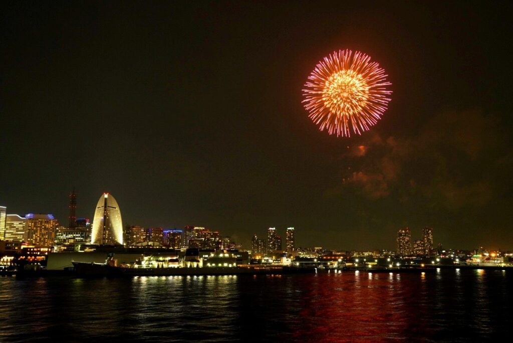 花火はみなとみらいエリアの多くの場所から観ることができますが、特にお勧めは大さん橋客船ターミナル。海側から横浜・みなとみらいの夜景とセットで花火を楽しめます。