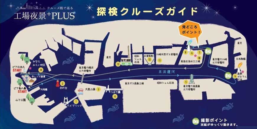 - ルート例:ピア象の鼻 → みなとみらい夜景 → 大黒ふ頭・東扇島 → 川崎の製油所・発電所 → 鶴見つばさ橋・ベイブリッジ → みなとみらい夜景 → ピア象の鼻
