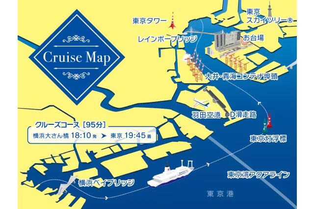 - 運航エリア:横浜港〜東京湾エリア(ベイブリッジ、みなとみらいなどが広角で見える)